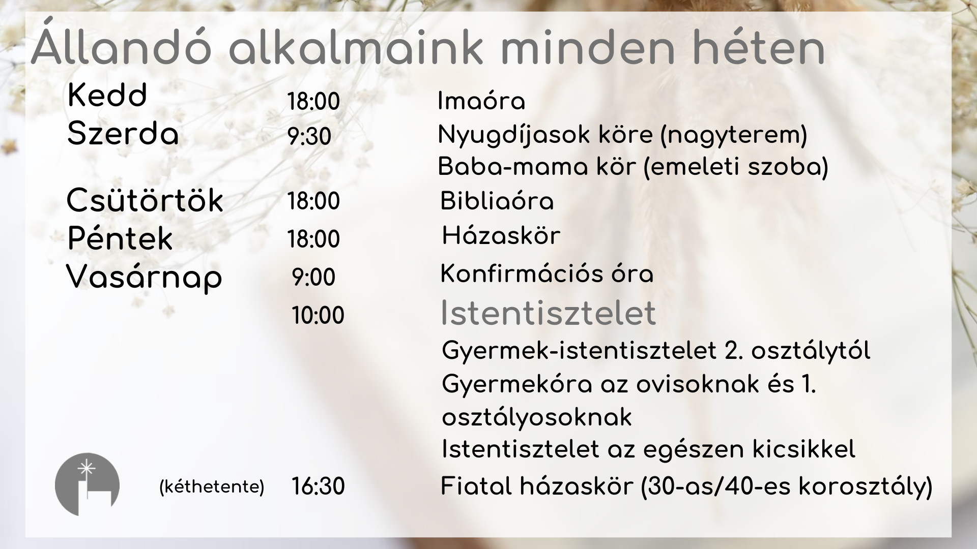 Youtube-videó: LINK (Előző/aktuális videóink a gyülekezetünk Youtube oldalán találhatóak.)